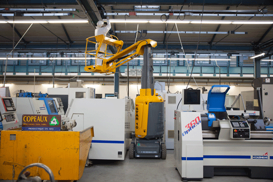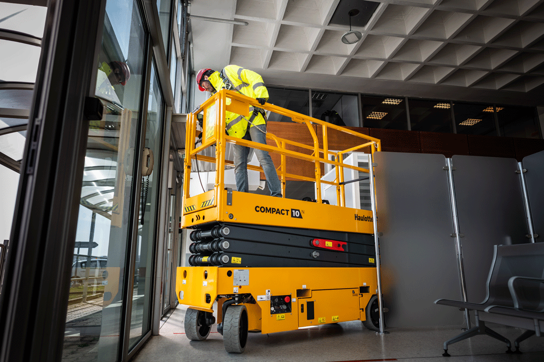 Las plataformas de tijera compactas o los mástiles verticales son excelentes opciones para espacios estrechos. Su menor tamaño facilita la maniobrabilidad en áreas restringidas. En la gama COMPACT de Haulotte, las barandillas pueden plegarse para pasar por puertas bajas, una característica muy útil para trabajos en interiores con aplicaciones específicas.
